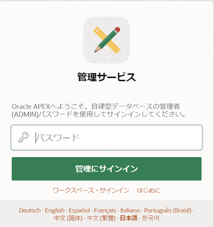 3. ADBインスタンス作成時に指定したADMINユーザのパスワード(本ガイドを参考に作成した方のパスワードは「Welcome12345#」)を入力し、サインインします。