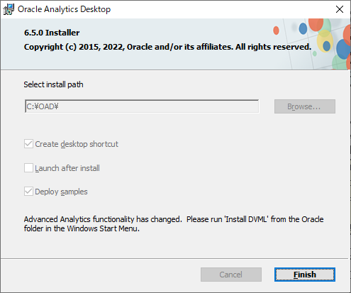 インストールが完了したら、 finish ボタンをクリックして、インストーラーを終了します。これで、Oracle Analytics Desktop をインストールできました。