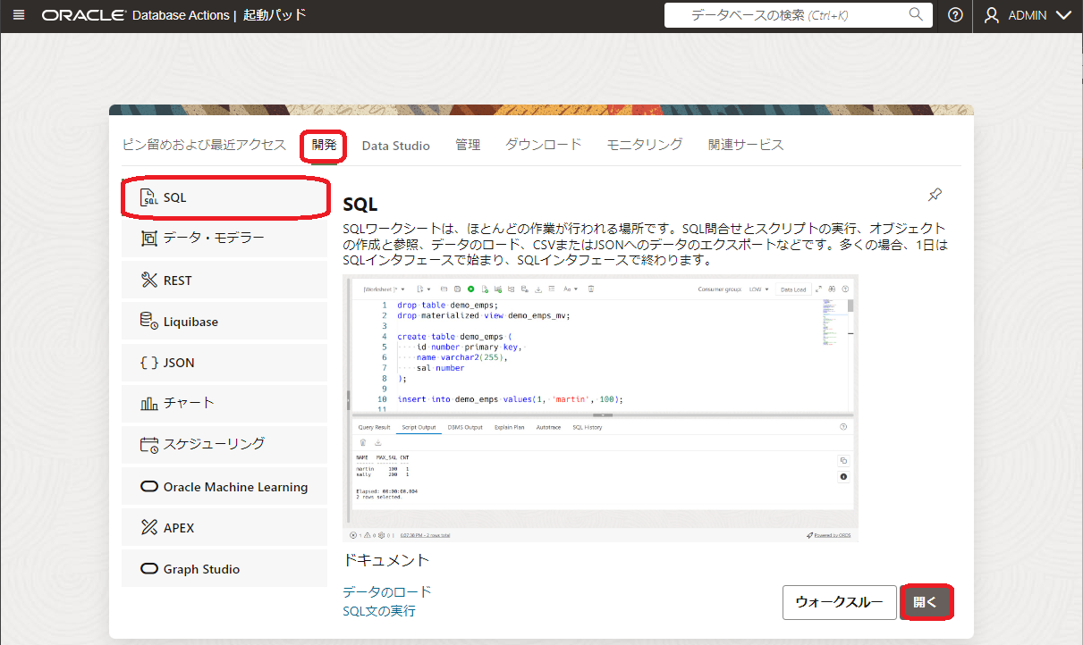 Database Actionsの起動パッドで SQL をクリックします。
