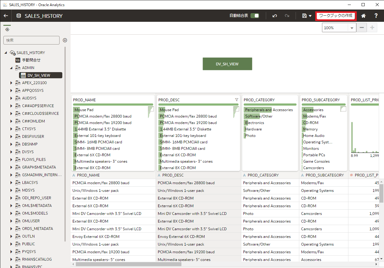 これで、見える化するデータの準備ができました。1行目の drop文は再実行用で、ビューがなければ、エラーとなります。drop文のエラーは問題ありません。drop view DV_SH_VIEW; create or replace view DV_SH_VIEW as select P.PROD_NAME, P.PROD_DESC, P.PROD_CATEGORY, P.PROD_SUBCATEGORY, P.PROD_LIST_PRICE, S.QUANTITY_SOLD, S.AMOUNT_SOLD, X.CUST_GENDER, X.CUST_YEAR_OF_BIRTH, X.CUST_MARITAL_STATUS, X.CUST_INCOME_LEVEL, R.COUNTRY_NAME, R.COUNTRY_SUBREGION, R.COUNTRY_REGION, T.TIME_ID, T.DAY_NAME, T.CALENDAR_MONTH_NAME, T.CALENDAR_YEAR from SH.PRODUCTS P, SH.SALES S, SH.CUSTOMERS X, SH.COUNTRIES R, SH.TIMES T where S.PROD_ID=P.PROD_ID and S.CUST_ID=X.CUST_ID and S.TIME_ID=T.TIME_ID and X.COUNTRY_ID=R.COUNTRY_ID;