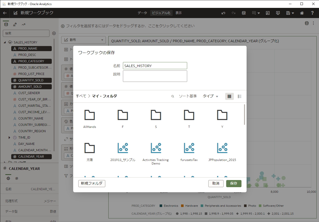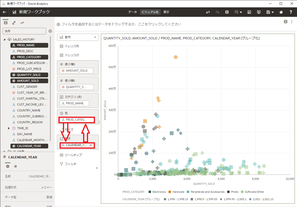 新規ワークブック画面に変わり、左に SALES_HISTORYビュー の列情報が表示されるので、SALES_HISTORYビュー内の5つのデータ要素( PROD_NAME、PROD_CATEGORY、QUANTITY_SOLD、AMOUNT_SOLD、CALENDAR_YEAR)を複数選択(Ctrlキーを押しながらクリック)し、画面の右側にドラッグ&ドロップします。