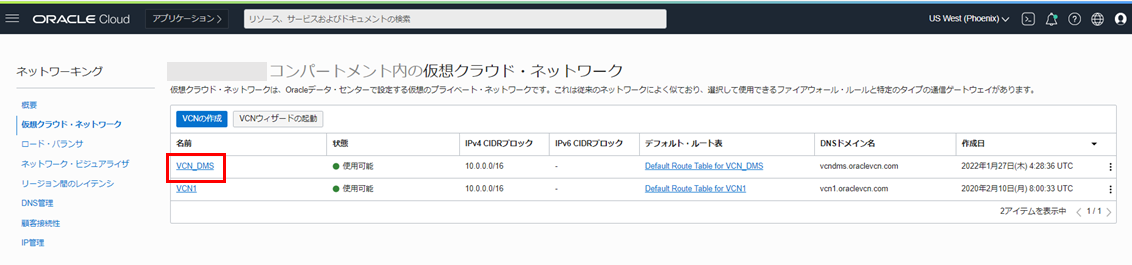 1. OCIコンソール・メニューから ネットワーキング仮想クラウド・ネットワーク に移動し、前提条件で作成したVCNを選択します。