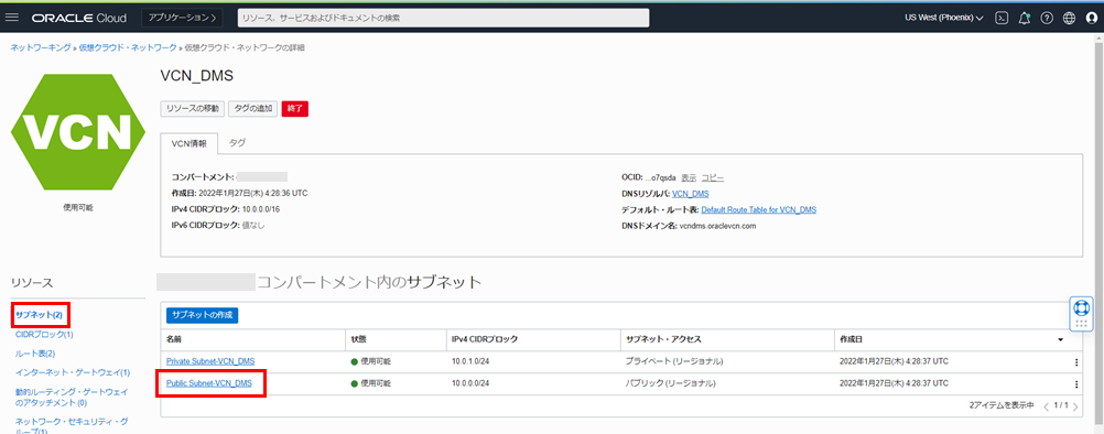 2. サブネット の一覧から Public Subnet-VCN名 を選択します。