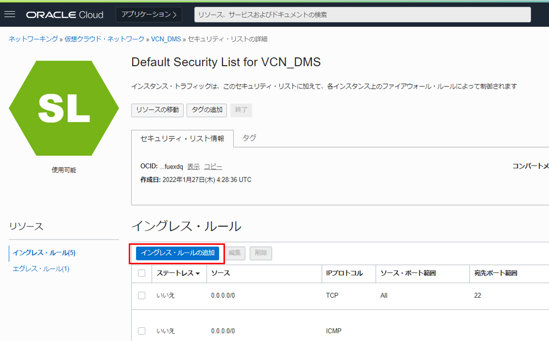 3. セキュリティリスト の一覧から Default Security List for VCN名 を選択します。
