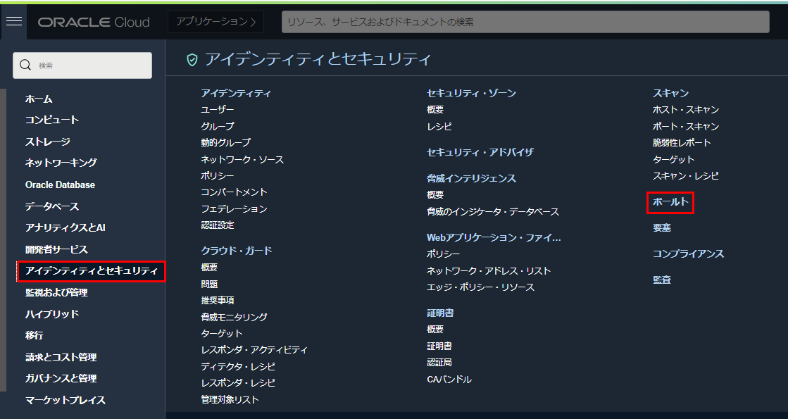 1. OCIコンソール・メニューから アイデンティティとセキュリティボールト に移動します。