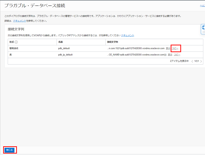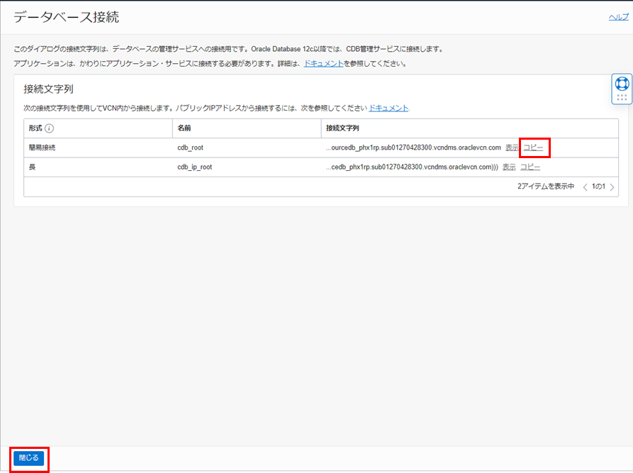 • 接続文字列 - 本チュートリアルの2-1.ソース・データベースのCDBとPDBの接続情報の確認の10.でメモ帳にコピーした接続文字列のホスト名部分をデータベース・ノードのプライベートIPアドレスと入れ替えて入力します。例:10.0.0.28:1521/pdb.sub01270428300.vcndms.oraclevcn.com