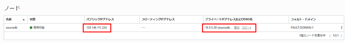 14. ソース・データベースのパブリックIPアドレスプライベートIPアドレス をそれぞれコピーし、メモ帳に貼り付けます。(後の手順で使用するため)