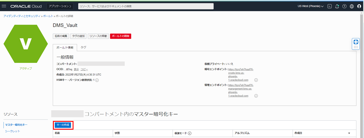 7. 作成したボールトをクリックし、 マスター暗号化キーキーの作成 をクリックします。