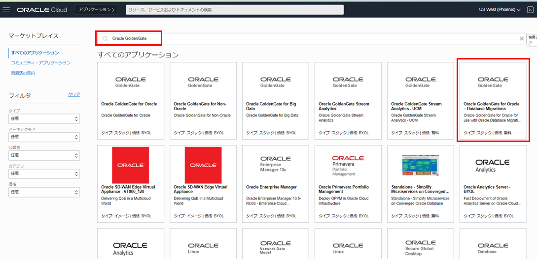 検索バーに Oracle GoldenGate と入力し、Oracle GoldenGate for Oracle - Database Migrations をクリックします。