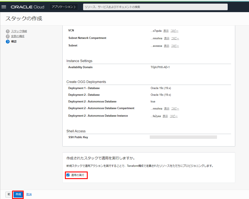 確認後、作成されたスタックで適用を実行しますか。 の 適用の実行 にチェックを付け、作成 をクリックします。