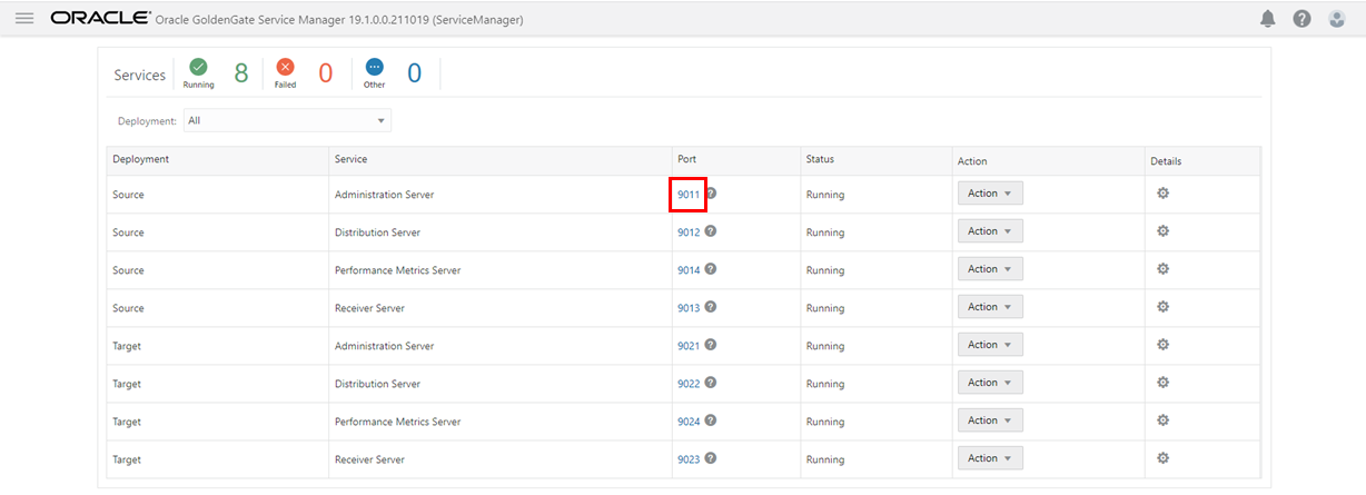 Services の一覧にあるソース・データベースの Deployment の Administration Server の Port 番号をクリックします。