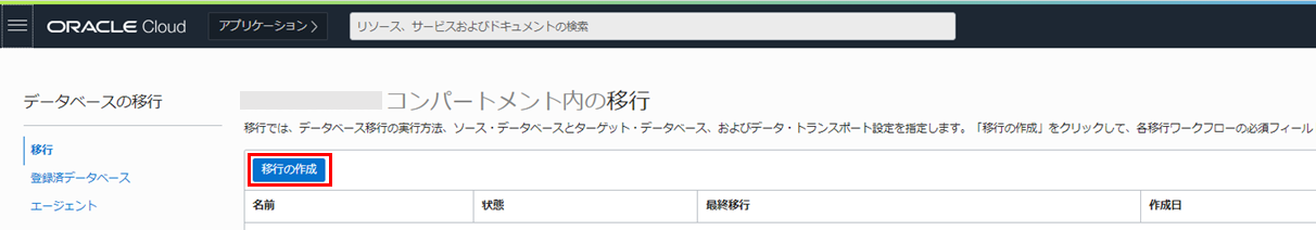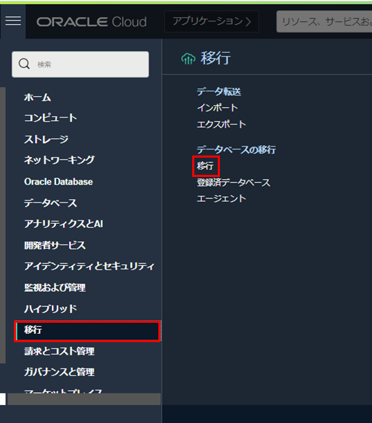 OCIコンソール・メニューから 移行 → 移行 に移動します。