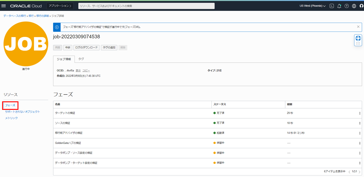 リソース の一覧にある フェーズ をクリックします。ここで実行中の移行のフェーズが確認できます。