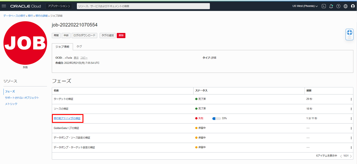 検証が失敗した場合、フェーズ の ステータス に失敗 と表示されます。その場合、 ログのダウンロード ボタンをクリックしてログを参照することで、失敗の詳細を確認することができます。もう一度実行したい場合は、 中断 ボタンをクリックして検証を再度やり直してください。