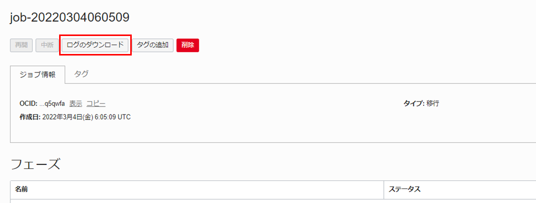 移行が失敗した場合、フェーズ の ステータス に失敗 と表示されます。その場合、 ログのダウンロード ボタンをクリックしてログを参照することで、失敗の詳細を確認することができます。もう一度実行したい場合は、 中断 ボタンをクリックして移行を再度やり直してください。