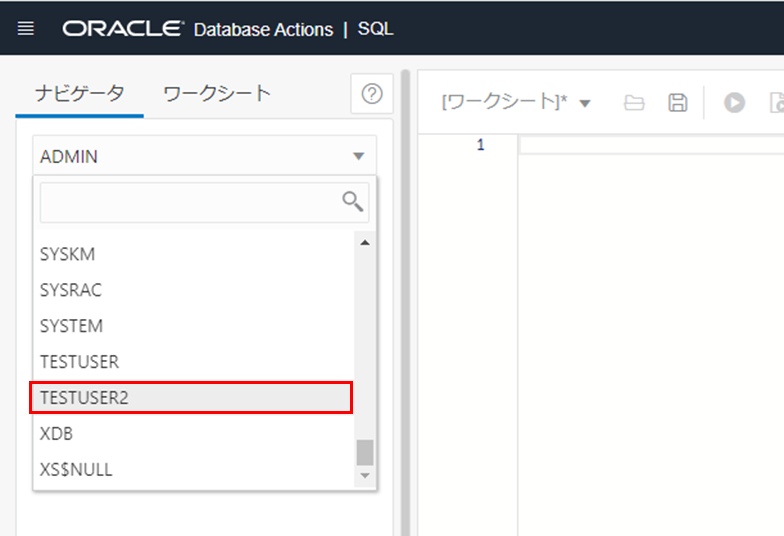 画面左にあるナビゲーターでソースPDBで作成したサンプル・データが格納されているスキーマがあることを確認し、選択します。