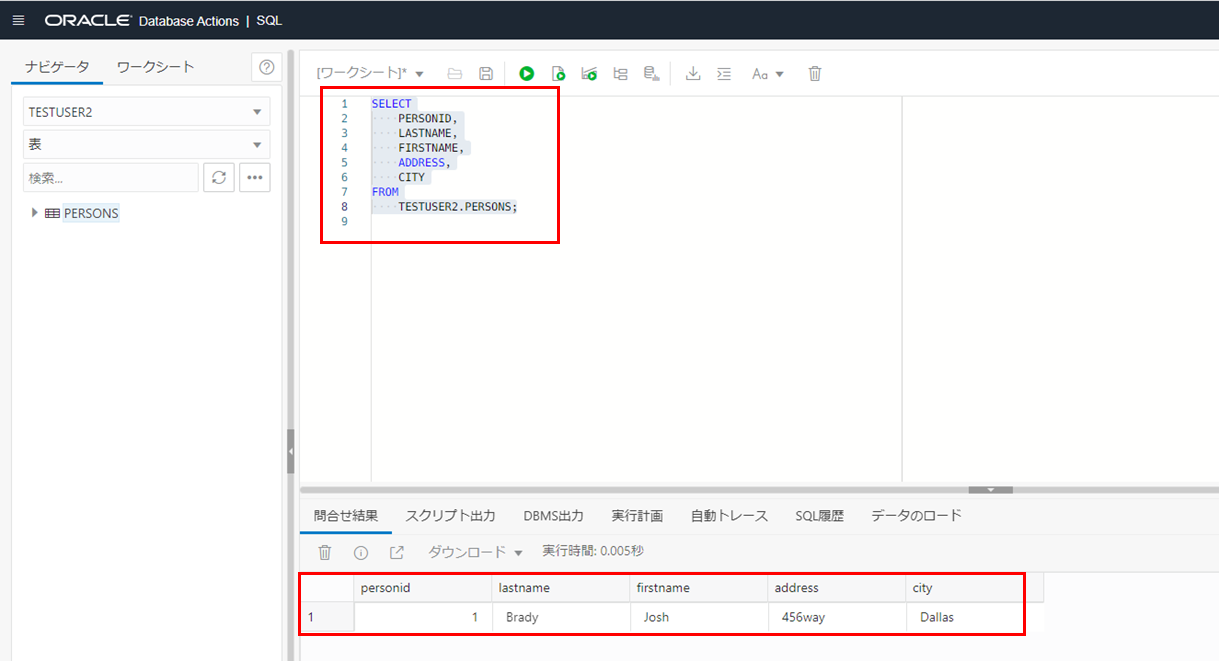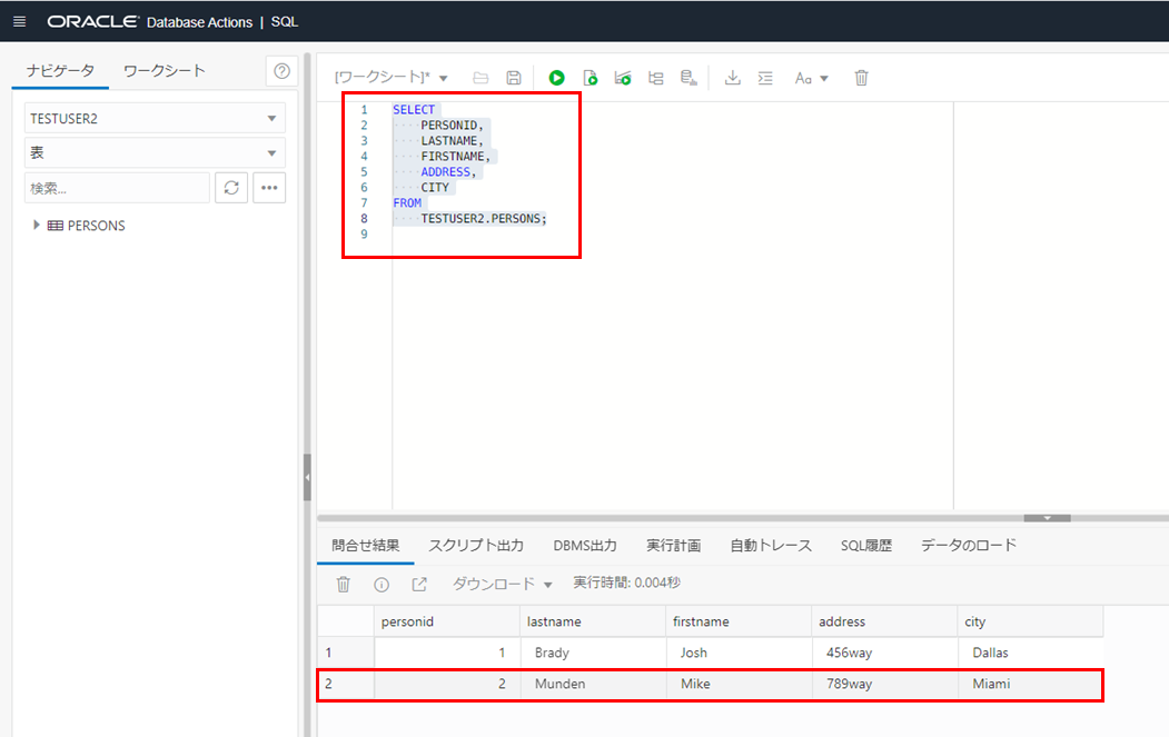 続いて、初期移行データがソースPDBからターゲットADBに正常に移行されているか確認します。