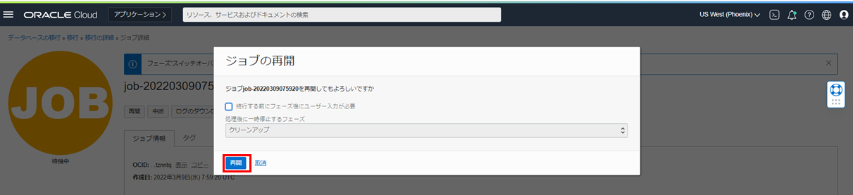 ジョブの再開 ダイアログが表示されます。続行する前にフェーズ後にユーザー入力が必要 にはチェックを付けずに 再開 をクリックします。