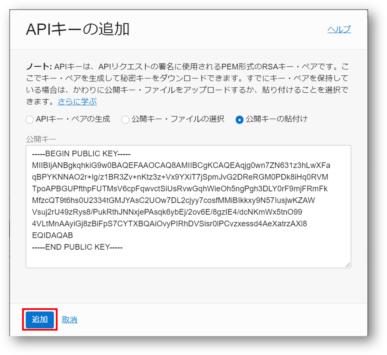 先程取得したAPI公開キーをペーストし、追加をクリックします。