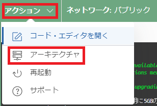 Cloud Shell 再起動後、「アクション」-「アーキテクチャ」選択します。そして、X86_64 であることを確認して、「取消」を選択します。