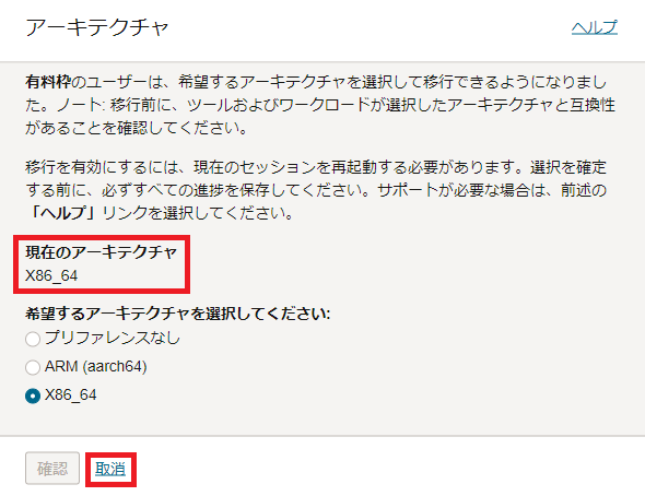 「現在のアーキテクチャ」が X86_64 の場合は、そのまま、「取消」を選択してください。