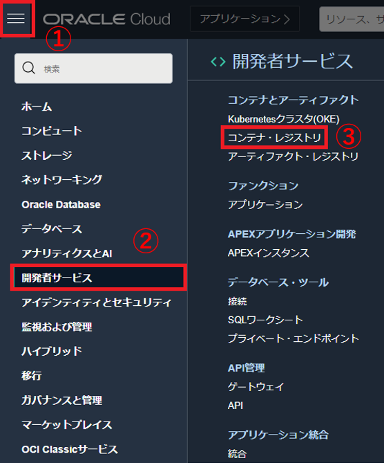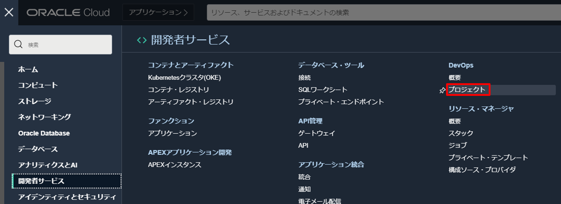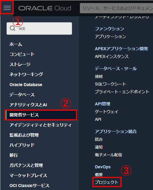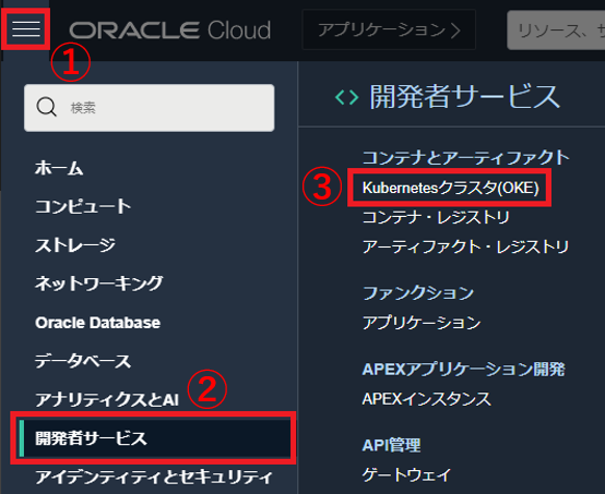 3ノード、1クラスタとして、OKEクラスタを構築します。 左上のハンバーガーメニューを展開して、「開発者サービス」から「Kubernetesクラスタ(OKE)」を選択します。