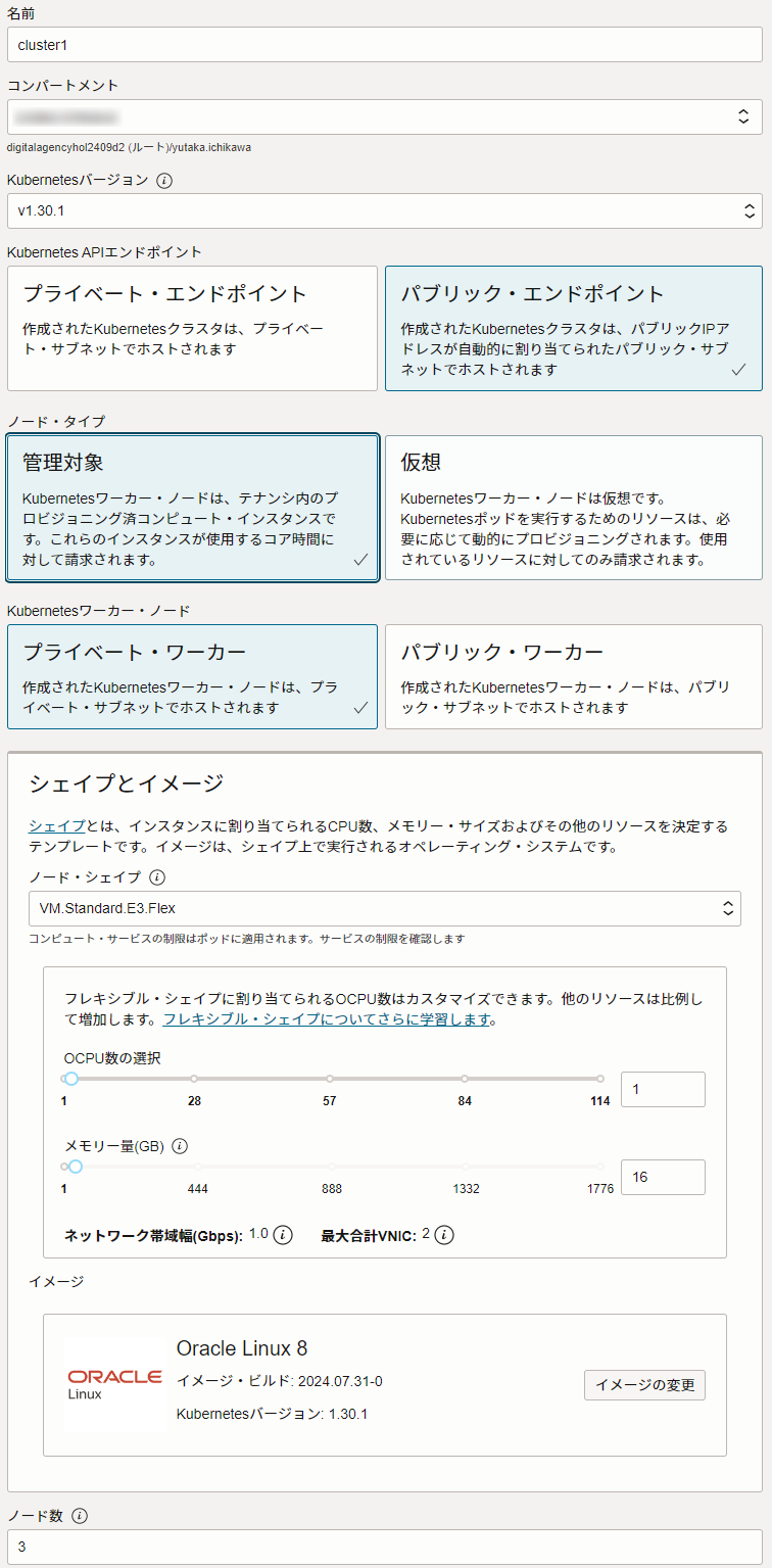 Kubernetesバージョンについて上記のスクリーンショットに表示されているKubernetesバージョンと実際にコンソールに表示されているKubernetesバージョンは異なる可能性があります。 このハンズオンでは、Kubernetesバージョンは特に問わないので、コンソール上で選択されているデフォルトのバージョンで進めてください。