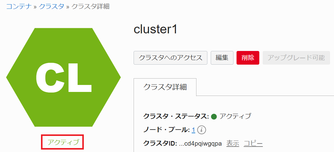 黄色の「作成中」から緑の「アクティブ」になることを確認します。「アクティブ」であればクラスタ作成は完了です。