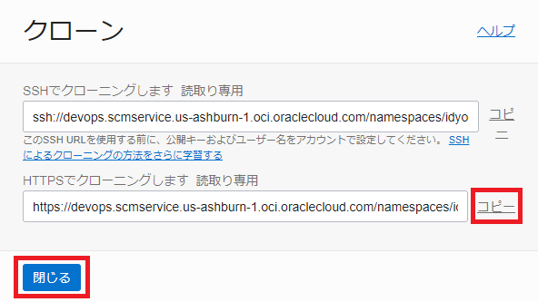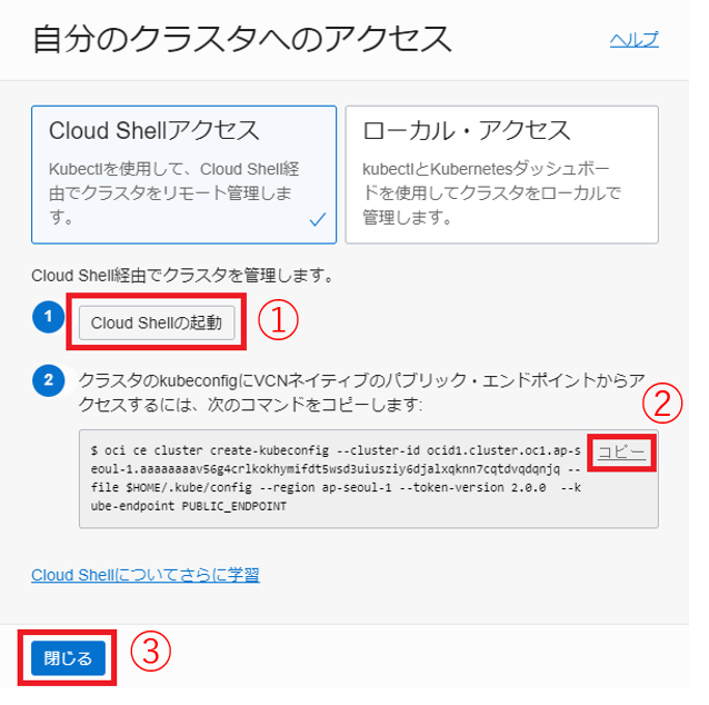 「Cloud Shellの起動」ボタン、「コピー」リンクテキスト、「閉じる」ボタンの順にクリックします。