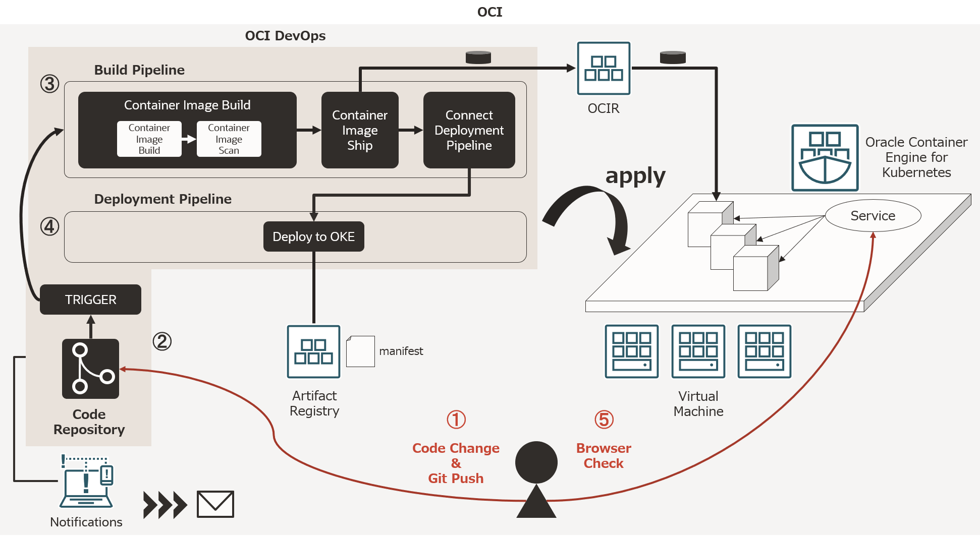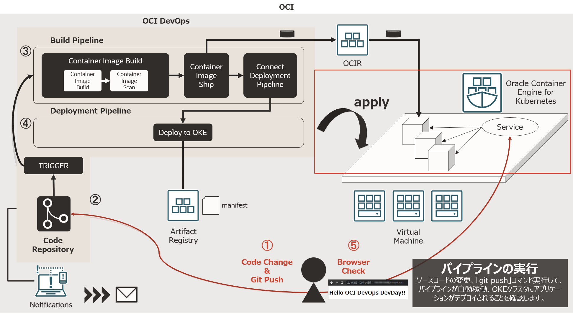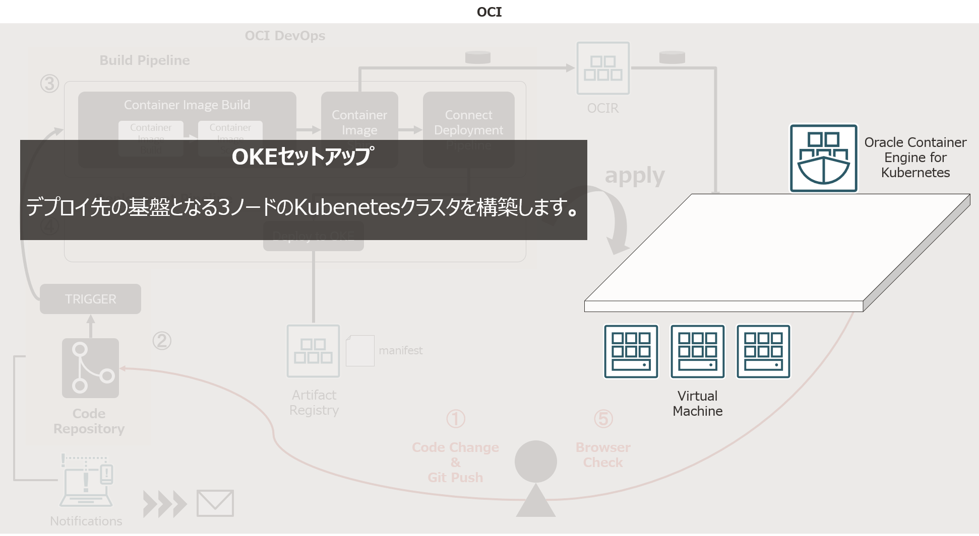 「OCI DevOps 環境構築」では、デプロイ先となるOKEクラスタの登録、コード・リポジトリとアーティファクト・レジストリの設定と管理、OCI DevOpsのパイプラインとなるビルド・パイプラインとデプロイメント・パイプラインの構築、パイプラインを自動化させるためのトリガー機能の設定、最後にソースコードの変更および「git push」コマンド実行を契機に、構築したパイプラインの稼働とデプロイされたアプリケーションの稼働を確認します。