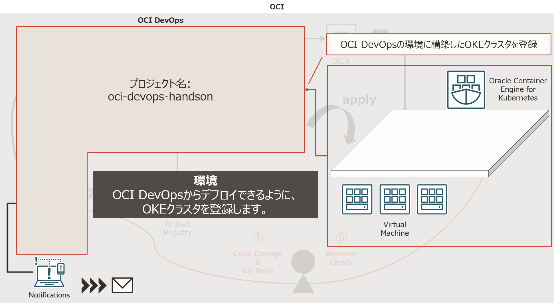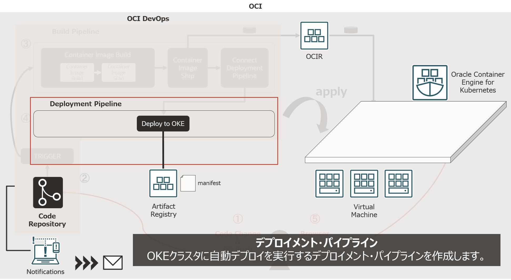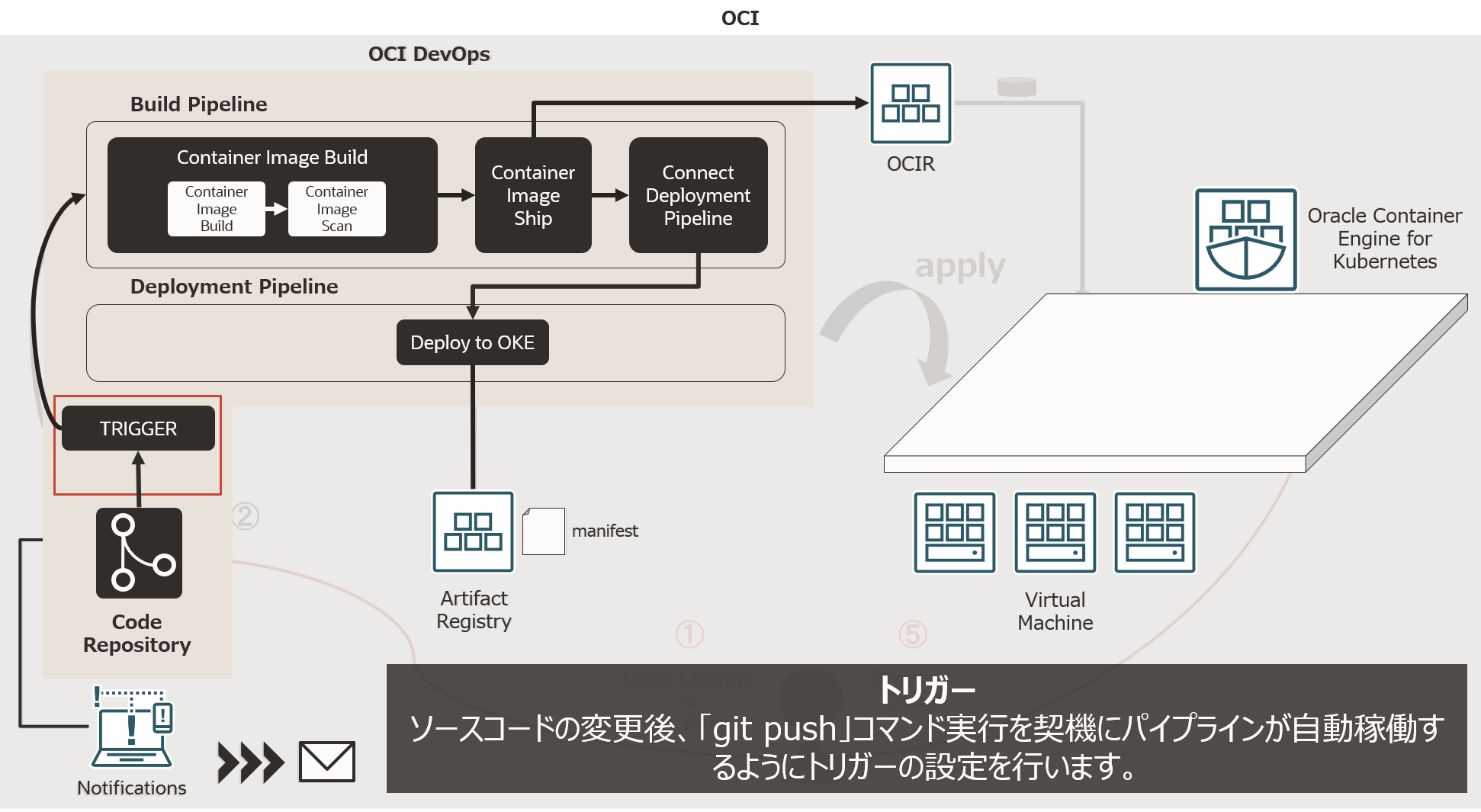 「OCI DevOps 環境構築」では、デプロイ先となるOKEクラスタの登録、コード・リポジトリとアーティファクト・レジストリの設定と管理、OCI DevOpsのパイプラインとなるビルド・パイプラインとデプロイメント・パイプラインの構築、パイプラインを自動化させるためのトリガー機能の設定、最後にソースコードの変更および「git push」コマンド実行を契機に、構築したパイプラインの稼働とデプロイされたアプリケーションの稼働を確認します。