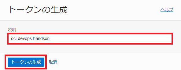 「説明」に「oci-devops-handson」と入力して、「トークンの生成」ボタンをクリックします。