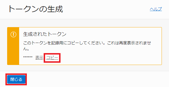 「コピー」をクリックして、「閉じる」ボタンをクリックします。 コピーした認証トークンは、後の手順で必要となるので、テキストエディタなどにペーストしておきます。