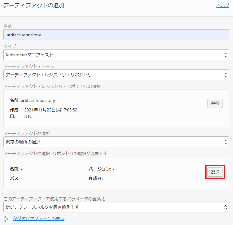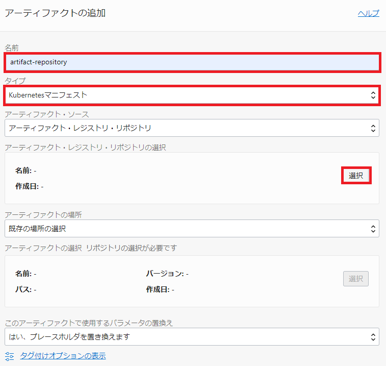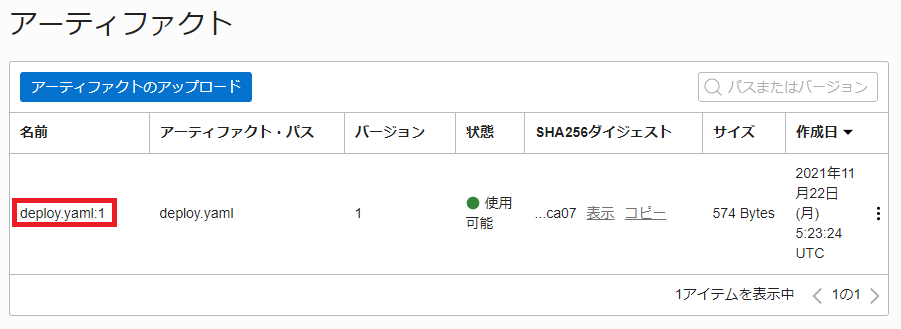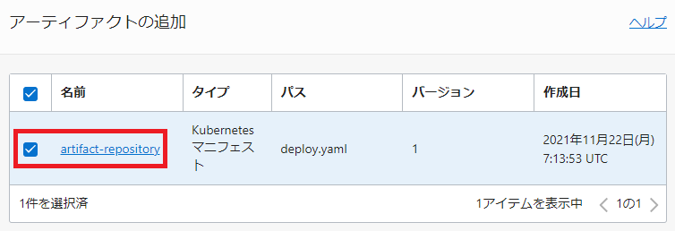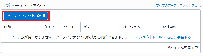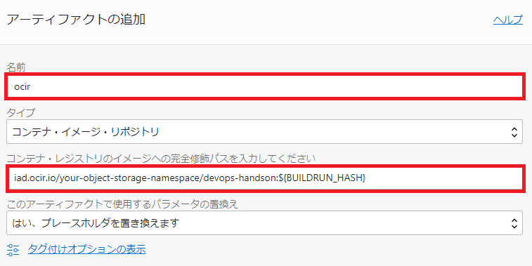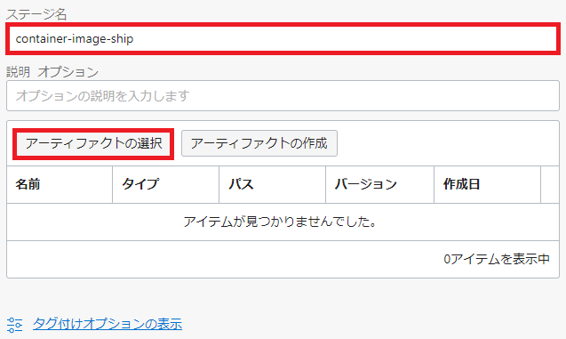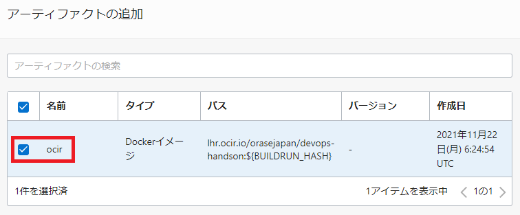 このhandson_imageという成果物を5.ビルド・パイプラインの手順内のビルド構成/結果アーティファクト名で指定し、アーティファクト・レポジトリにアップロードしました。