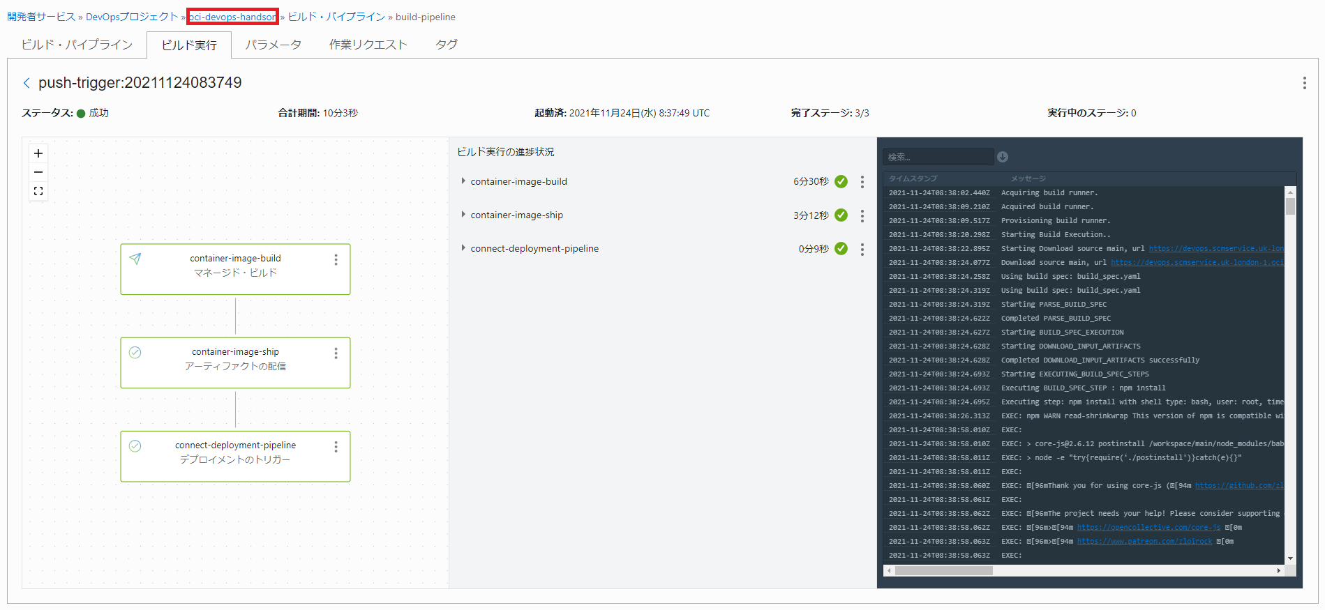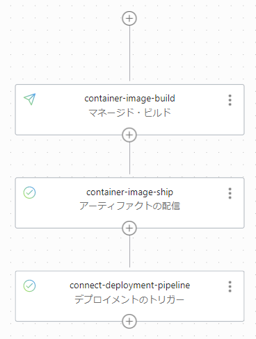 ビルド・パイプラインの経過を確認できます。全て問題なければ、グリーンのチェックアイコンが表示されます。