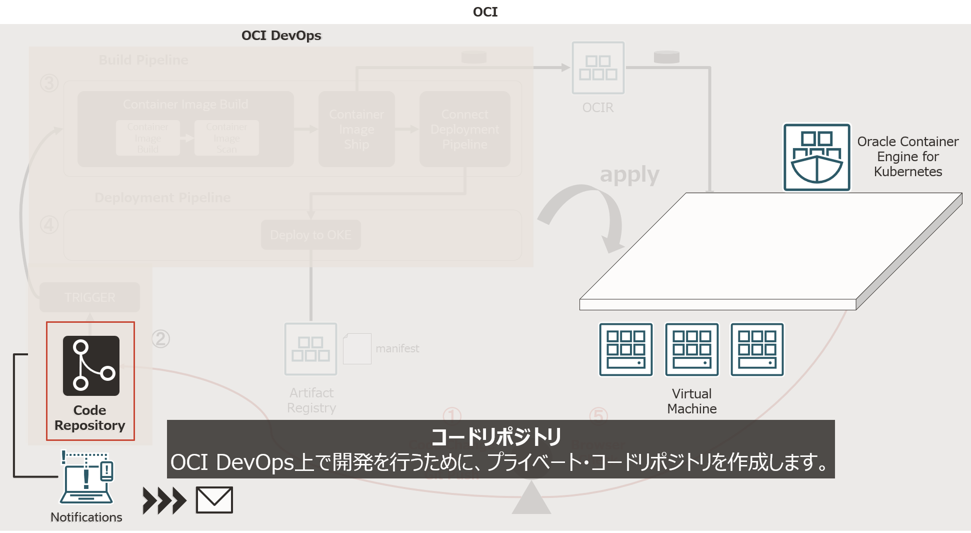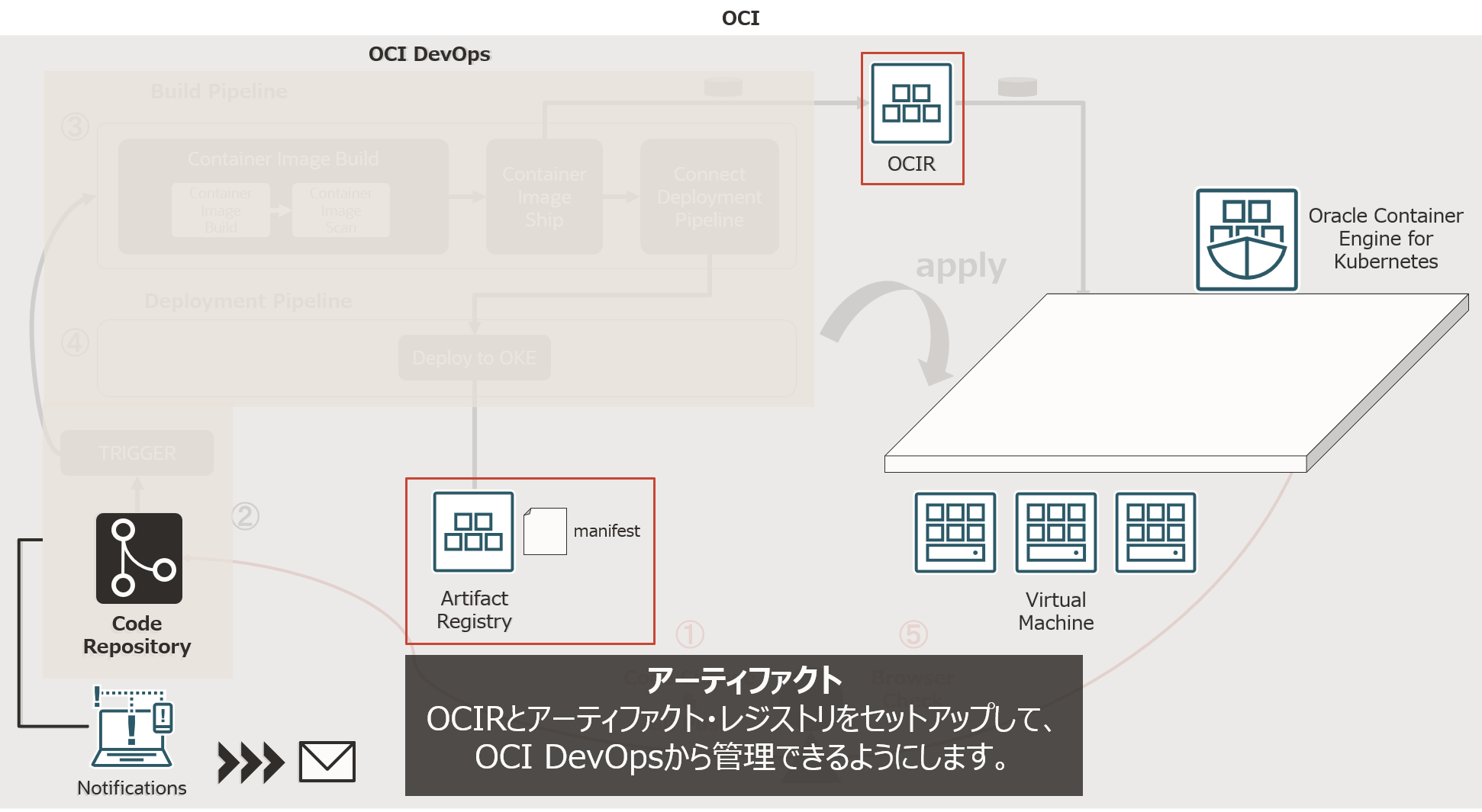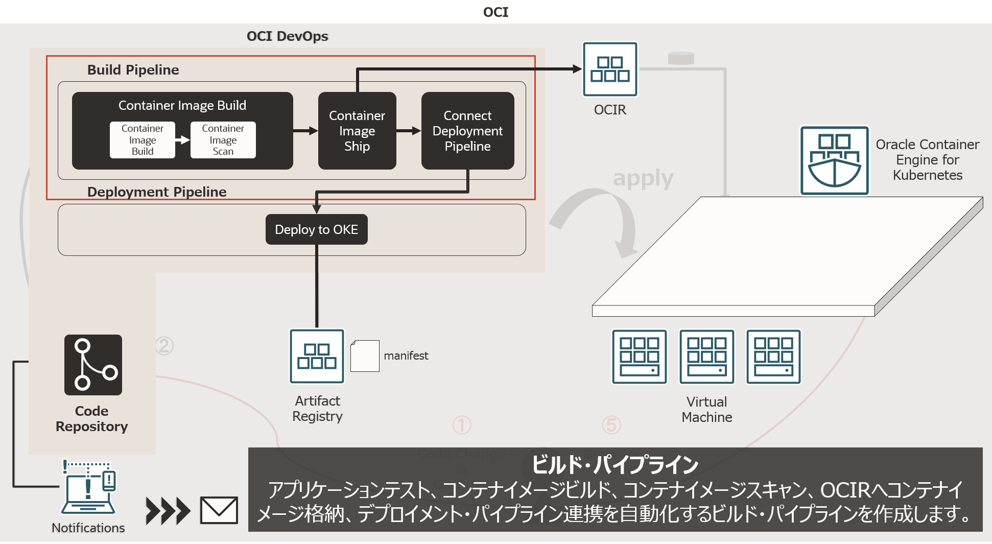 コンテナレジストリコンテナレジストリは、コンテナイメージを保存および共有するための専用のレジストリです。OCIには、Oracle Cloud Ifrastructure Registry(OCIR)というコンテナイメージ専用のレジストリサービスがあります。OCI DevOpsと統合して利用します。 詳細はこちらのページをご確認ください。