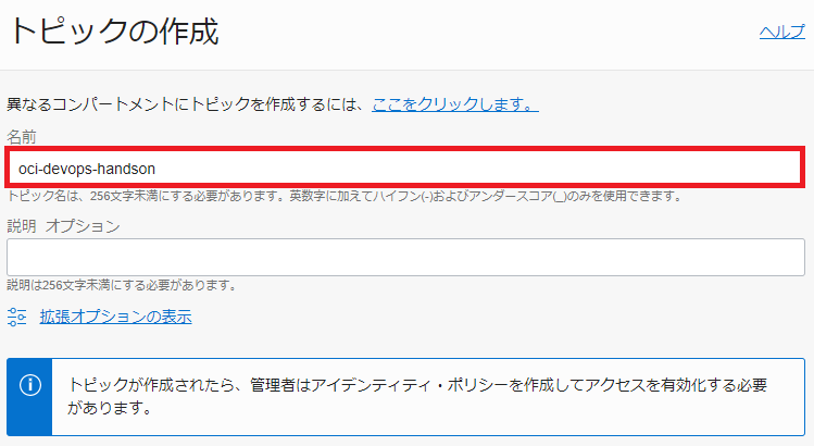 トピックの名前についてトピックの名前はテナンシで一意になります。 集合ハンズオンなど複数人で同一環境を共有されている皆様は、oci-devops-handson-01やhandson-tnなどの名前のイニシャルを付与し、名前が重複しないようにしてください。