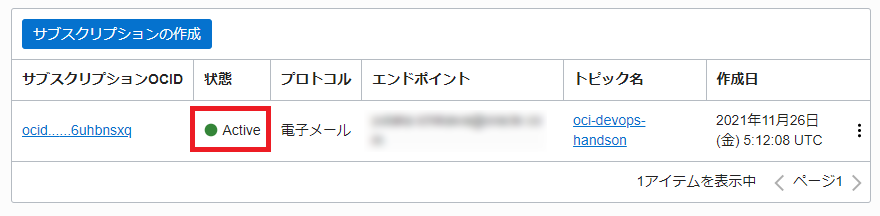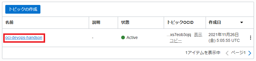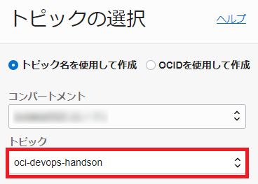 「トピック」が「oci-devops-handson」であることを確認します。