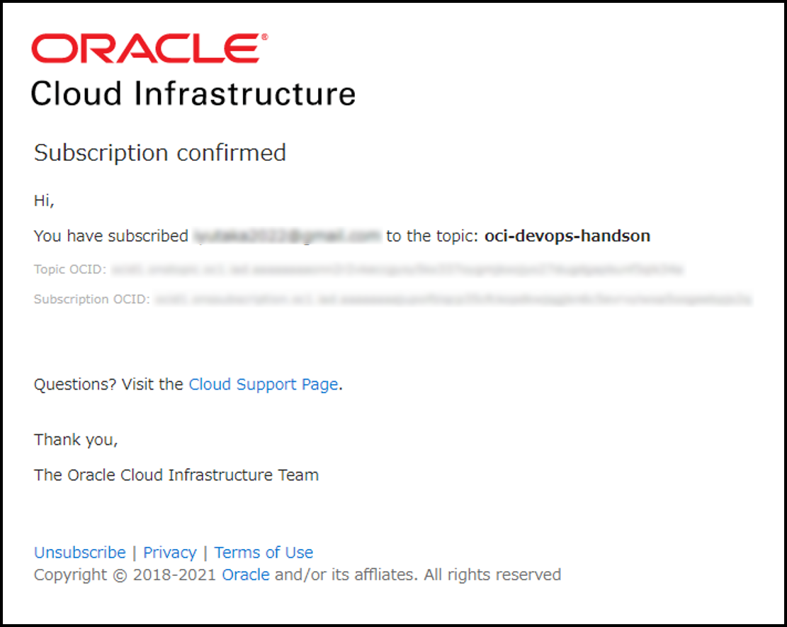 この設定をしておくことで、登録したメールアドレスに OCI DevOps から通知を受け取ることができます。