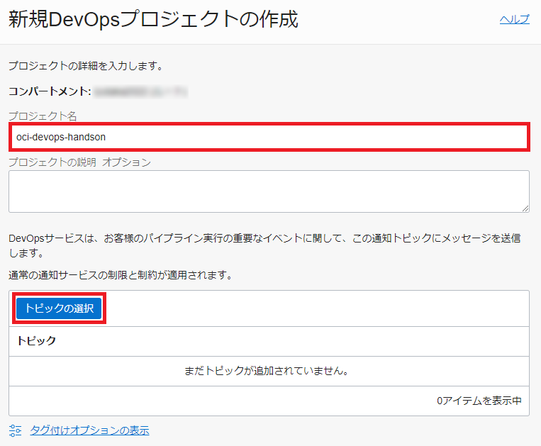 「プロジェクト名」に「oci-devops-handson」と入力して、「トピックの選択」ボタンをクリックします。