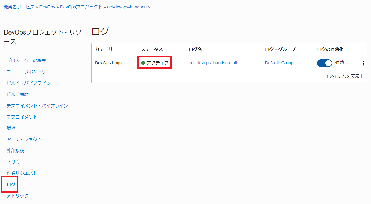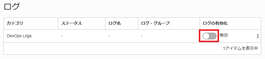 左メニューの「ログ」を選択して、「Active」となっていることを確認します。