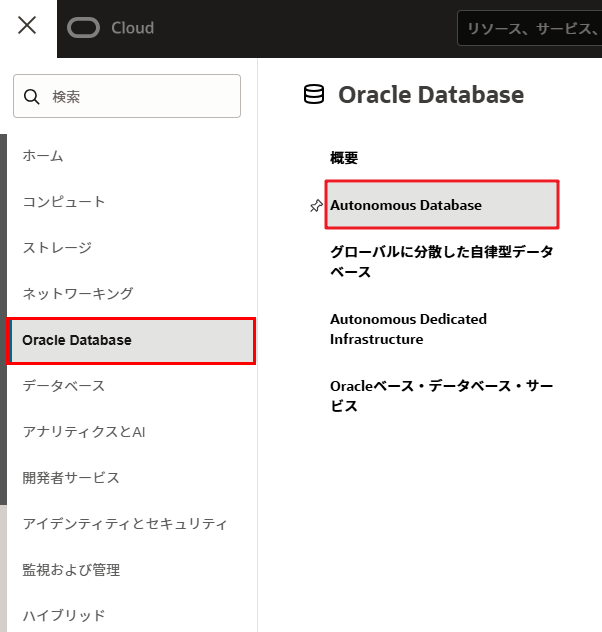 OCIコンソールのハンバーガーメニューから[Oracle Database]で、[Autonomous Database]をクリックします。