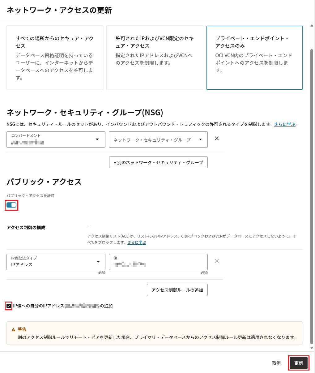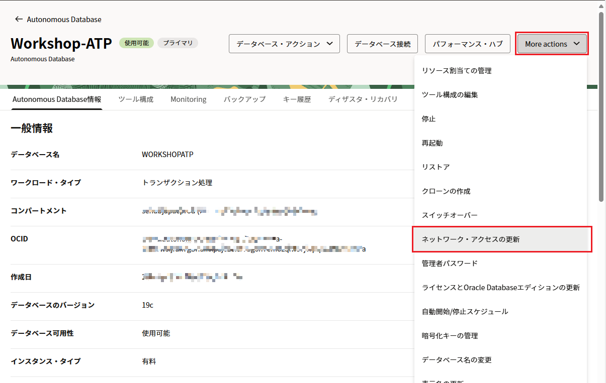 Autonomous Databaseの詳細の画面から[More actions]で、[ネットワーク・アクセスの更新]をクリックします。