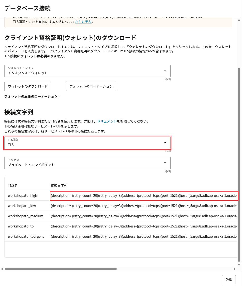dsn:ATPへの接続文字列。1-1.ATPのプロビジョニングで取得した値を使用します。