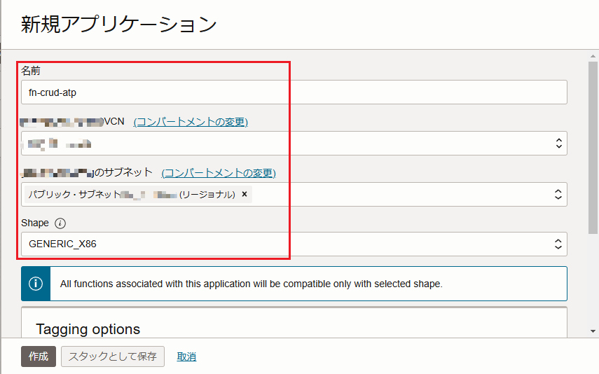 - Shape:OCI Functions を実行するために使用される基盤となるコンピューティング環境。今回はGENERIC_X86を指定。
