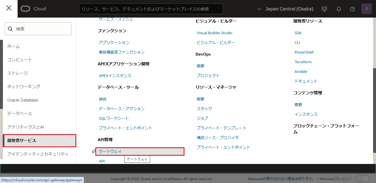 OCIコンソールにログインし、[開発者サービス]に移動して、[API管理] => [ゲートウェイ]をクリックしてから、次の操作を行います。