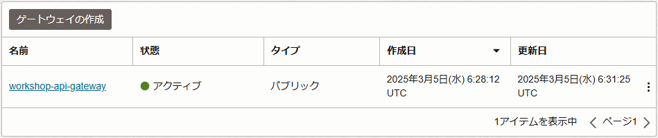 新しいAPIゲートウェイが作成されると、[ゲートウェイ]ページのリストにアクティブと表示されます。