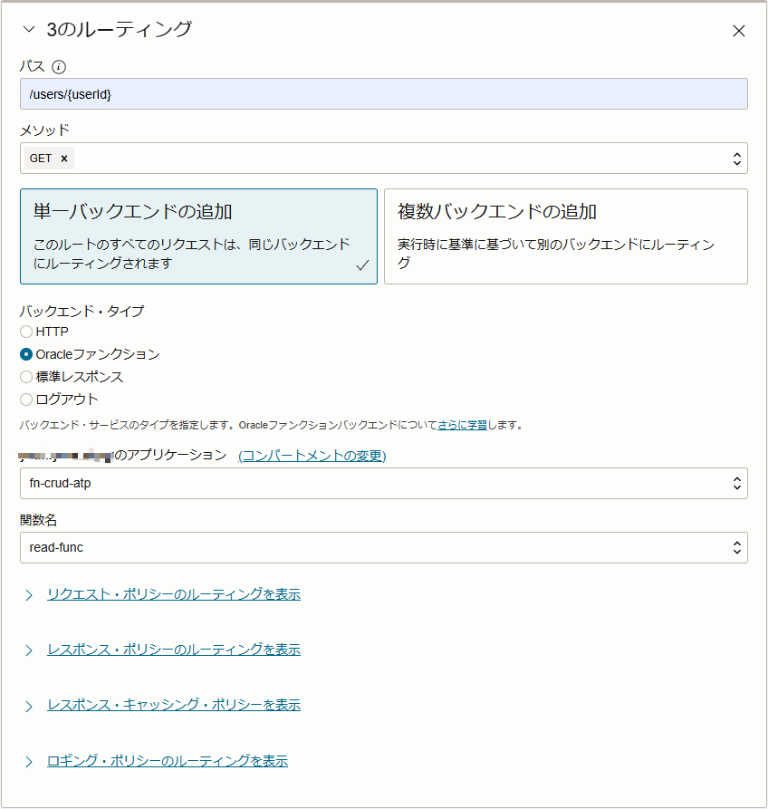 コンパートメント:OCI API Gatewayリソースを作成するコンパートメントの名前(こちらのワークショップではFunctionと同じコンパートメントを指定してください)
