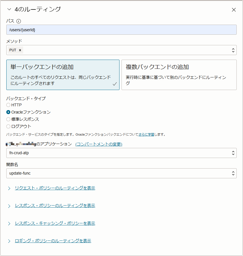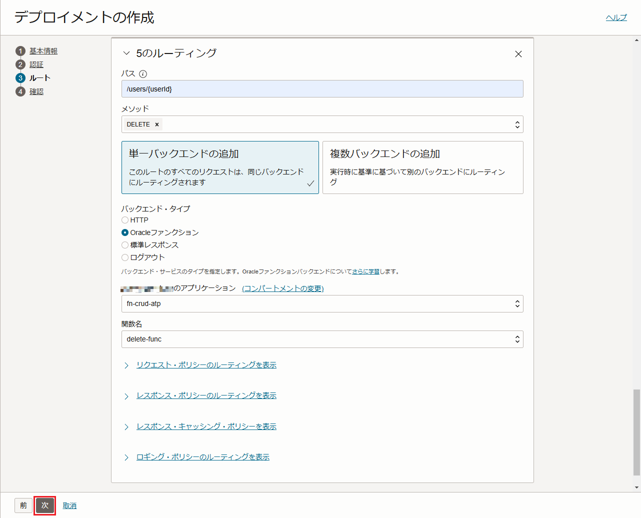 - サブネット:Functionを実行するサブネット。今回は、OCI Functions ハンズオンで作成したVCNのパブリック・サブネットを指定。