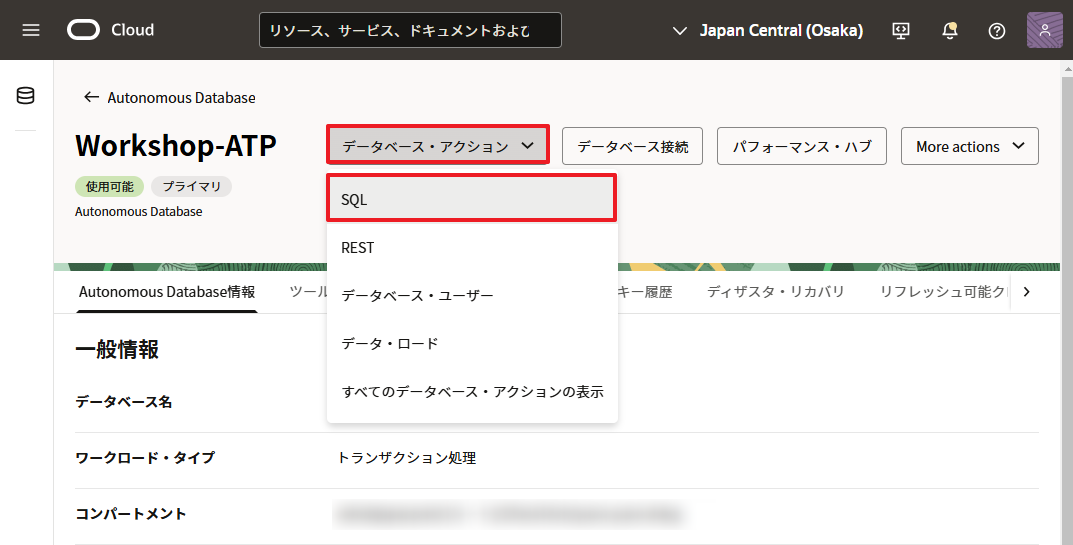 Autonomous Databaseの詳細の画面で、「データベース・アクション」→「SQL」をクリックします。